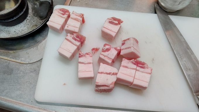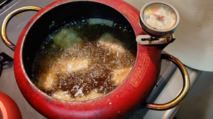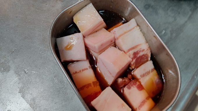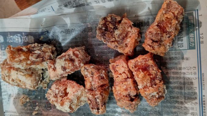 つくるしかない 豚バラ唐揚げ編ブラック2023.04.24チャーシューの時に使った豚バラブロックで唐揚げ作るよ。切ったら醬油ベースの漬けダレに漬ける。丸一日以上つけるから、タレは薄めの味付けに。 片栗粉を付けて 揚げる! ホイ、完成~ 弁当に持ってきますよと。ジューシーで美味し!
