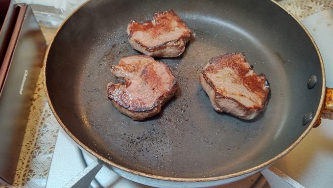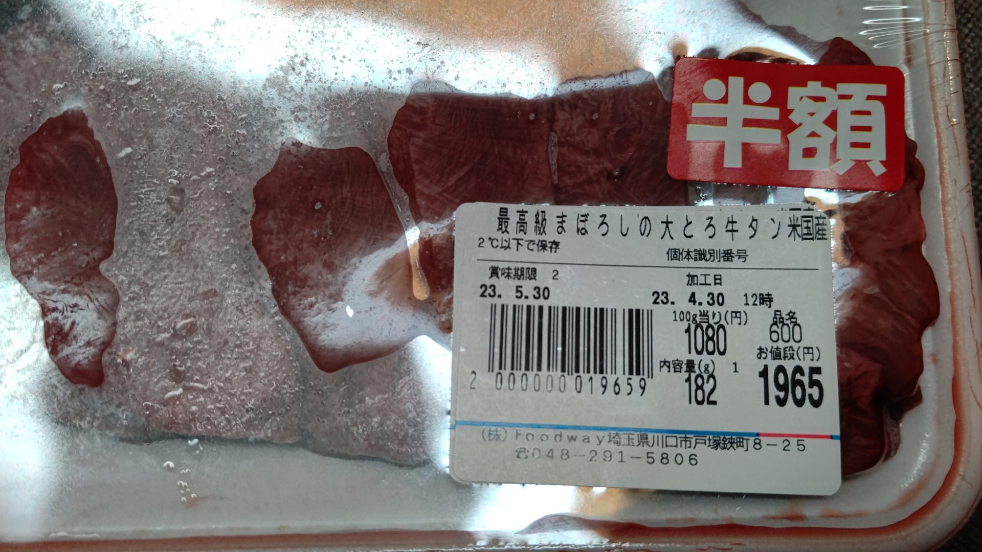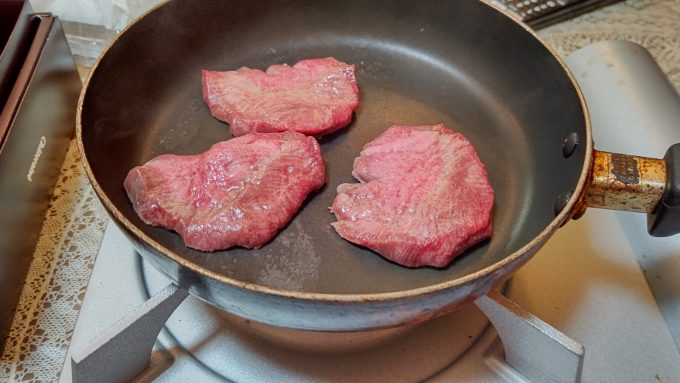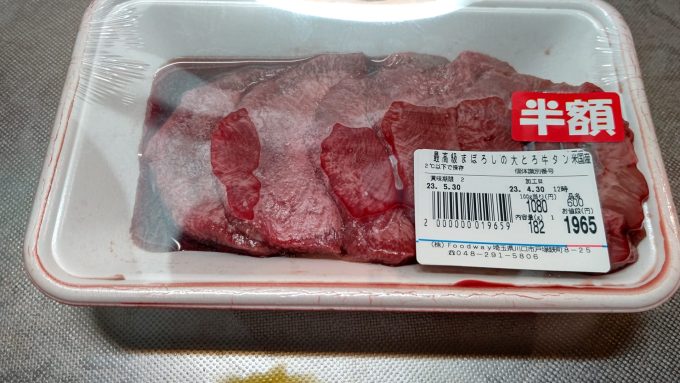 まぼろしの大トロ牛タンブラック2023.05.14この前行ったフードウェイで買ったアレを頂きますよ。それは… 最高級まぼろしの大トロ牛タン~ 見事な肉厚、実に美味そう! カセットコンロにフライパンで、即席焼肉~ こっちも準備OK(笑) ひょ~、良い色。 良し、頂くぞい! うむ!肉厚で実に美味し!流石最高級まぼろし!