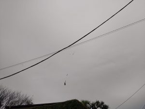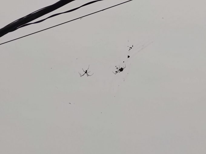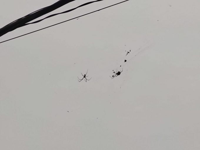 ゴミ出し帰り、ふと見上げると…ブラック2021.10.26ゴミ出し終えて家に戻る途中、ふと上を見上げると… 電線になんかぶら下がってる。ズームすると 蜘蛛デカッ‼ 小さい点々はおそらく子蜘蛛。蜘蛛って他の蟲食べてくれるから益虫っちゃあ益虫なんだろうけど、こうデカいのは勘弁だね(笑)