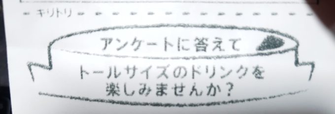スタバ新作ブラック2022.09.28職場の面々に刺激されて飲みましたよと。新作焼き芋ブリュレフラペチーノ!正直言うよ… 実はワシャ焼き芋好きでない! でもコイツは芋芋してる訳でもなく、甘くて実に美味し!今年飲んだ新作で1番の当たりです。 そしてさ、コイツ買った時のレシートが アンケート付き コイツに答えりゃトールサイズ1個無料。店員さん曰く、1日1個出るかレベルのレアものだとか。こりゃ運がええのう。