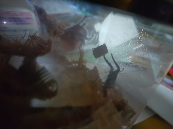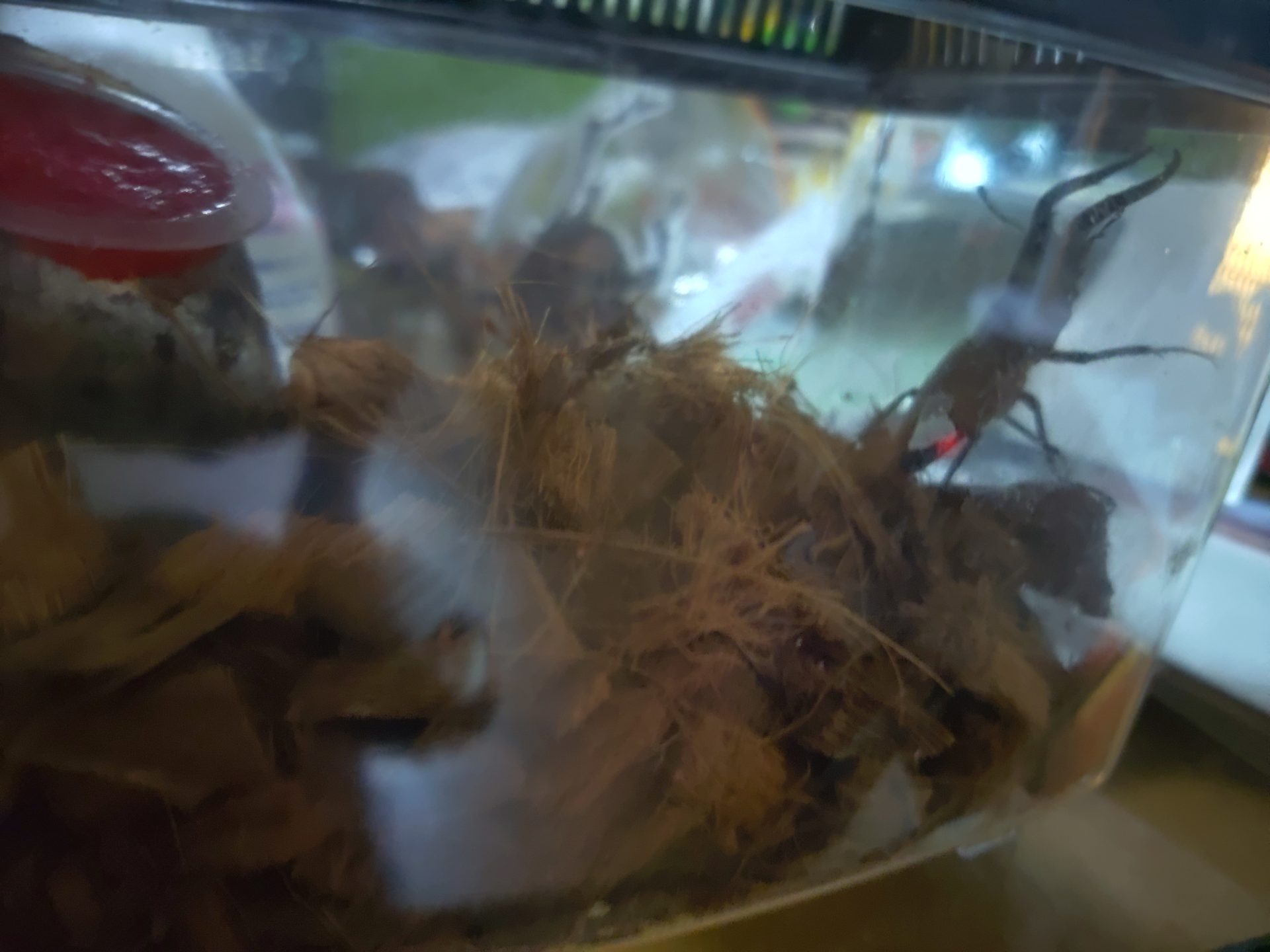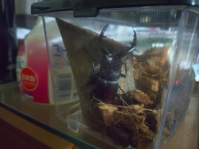 ノコギリクワガタ~ブラック2022.07.16あんまり動かないから不安になるけど、とりあえず元気ではありますよん。ま、ちゃんとエサ食べてるし、潜る位置も定期的に変わってるからねえ。そんなある朝、ノコギリクワガタの様子を見てみると…。 ハサミに木が刺さってる~!これはどうすりゃいいんだ?下手に取ろうとしたら、ハサミが折れる可能性もあるし…。とりあえず様子見でそのまま出勤。 んで帰宅。ではクワガタはどうだ? 良かった、ちゃんと取れてる。
