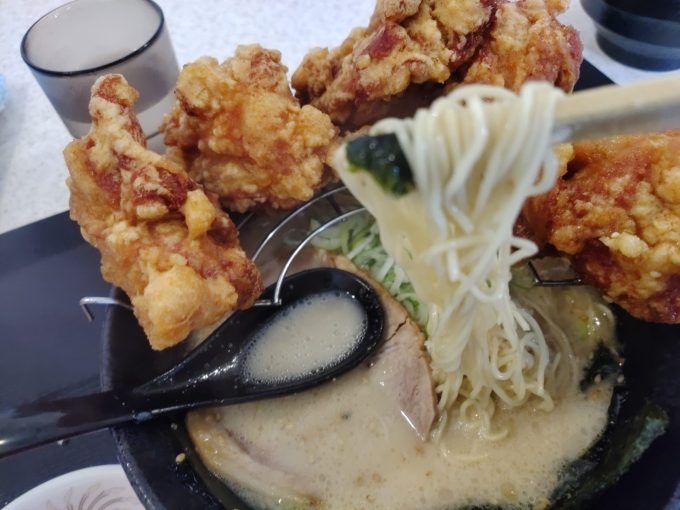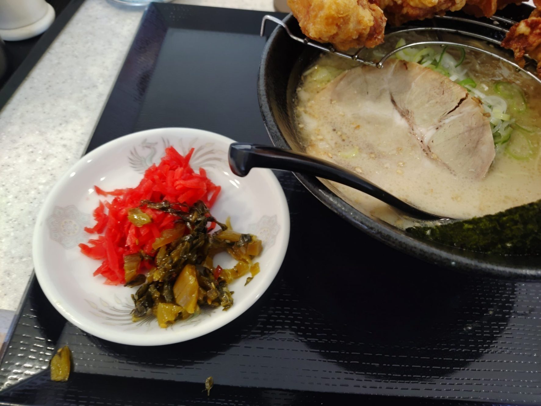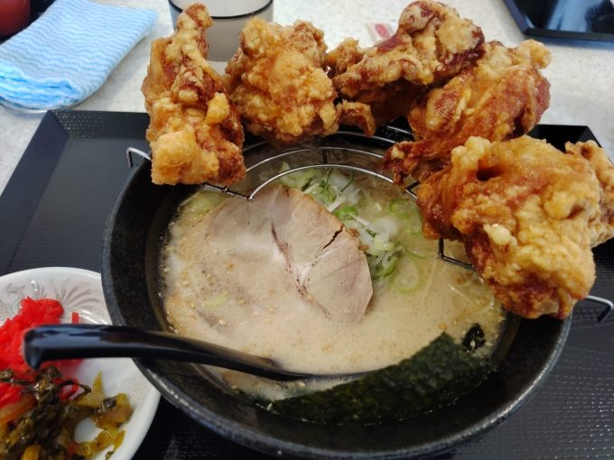一骨麺のスタミナラーメンブラック2022.07.05お昼に唐揚げが美味いラーメン屋、一骨麵へGO!!GO!!7188~今回注文したのが… 見よ!この夢のコラボ!これぞスタミナラーメン!唐揚げだけではなくチャーシューもちゃんと入ってるのが良いね!そして衣がふにゃふにゃにならない様、ちゃんと分けてるのも素晴らしい。ラーメンは九州系の細麵豚骨。 九州ラーメンだから、勿論高菜と紅ショウガもあるでよ。