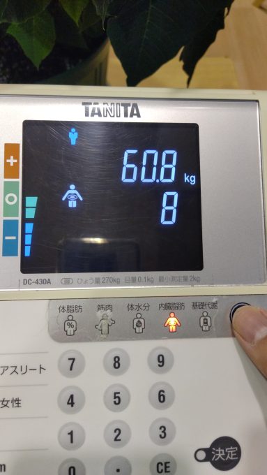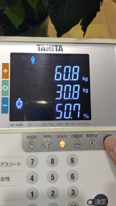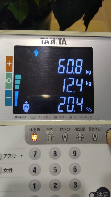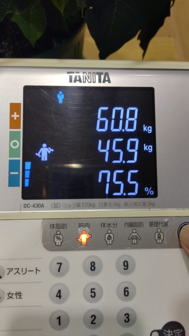 体重戻すぞトレーニング‼ 再び体重計乗ってみた。ブラック2021.12.12スポセンのトレーニングはまだ続けてますよ。体重戻すために。 今回健康診断から約1か月ぶりに体重計ってみようと思います。さて、気になる結果は… お~、体重減ってる減ってる。ん? 筋肉量が減って体脂肪率増え取るやんorz つまり痩せたんじゃなくて、筋肉減っただけorzこりゃまだまだ頑張らねば‼