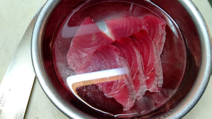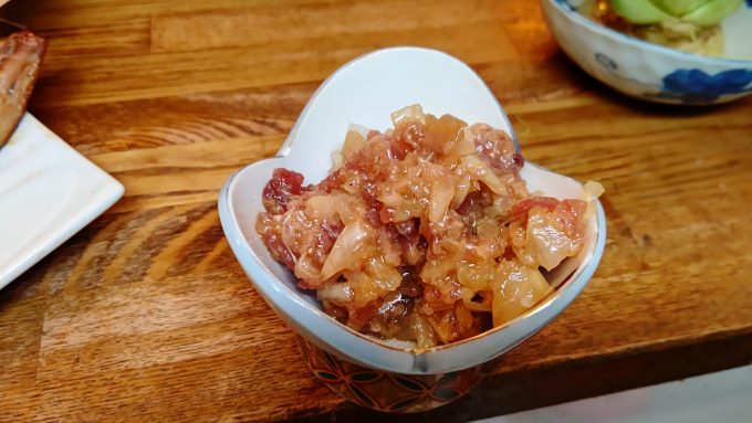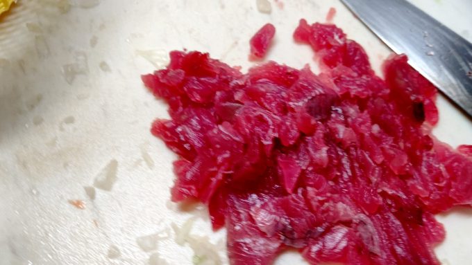 作るしかない 家事ヤロウでやってたカツオのタルタル編ブラック2022.10.30家事ヤロウでやってたカツオのタルタルを作るぞー! もう今年は出てこないであろう最後の生カツオ。コイツを塩水に浸けて生臭をとる。 3分後カツオをとり、水分を抜き、玉ねぎとラッキョウをみじん切り。 レモン汁をかけたカツオを叩きにする! みじん切りにしたラッキョウと玉ねぎに、おろしにんにく、レモン汁、醬油、オリーブオイル、塩コショウを混ぜカツオと混ぜて完成~ うむ!実に美味し!