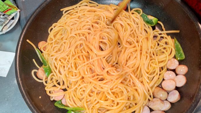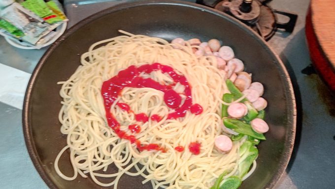 作るしかない 弁当にナポリタン編ブラック2023.02.02今日の弁当はナポリタンだ~!何故って⁉ 朝ドラ「舞いあがれ!」で貴司君が作ってたからさ(笑) ではクッキング! パスタはいつもの通り、レンジでパスタでお手軽に。 その間に具材をキリタニ おりゃ!男炒め! 良い色になって来たのう うむ、我ながら良い出来じゃ。
