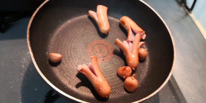 んでその間に、ウィンナーをわざわざタコさん状に切ってから焼くのでさぁ。
