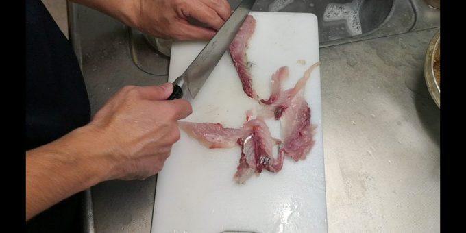 おろした身を、適当にぶった切ります。