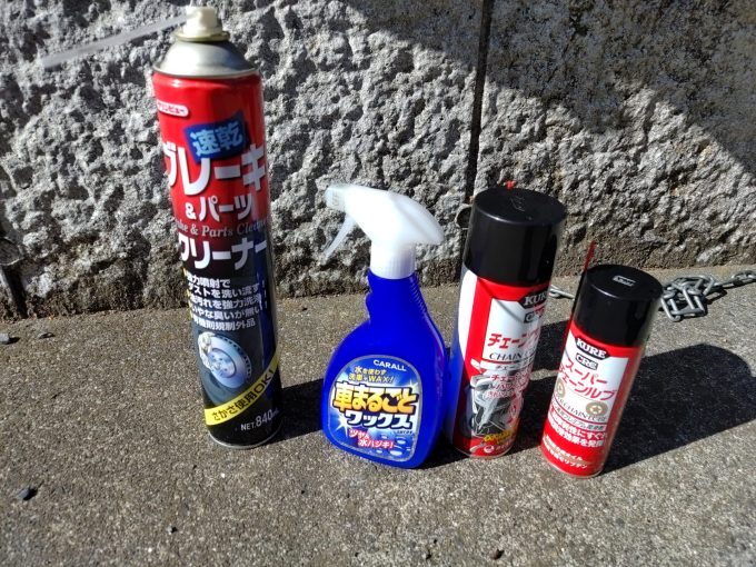 基本はボディやフレーム等をスプレーワックスで拭き、パーツクリーナーでブレーキを、チェーンクリーナーでチェーンを清掃し、チェーンはチェーンルーブで注油。