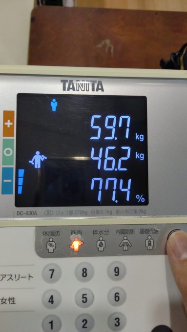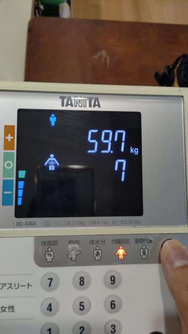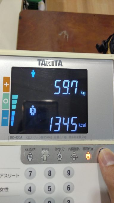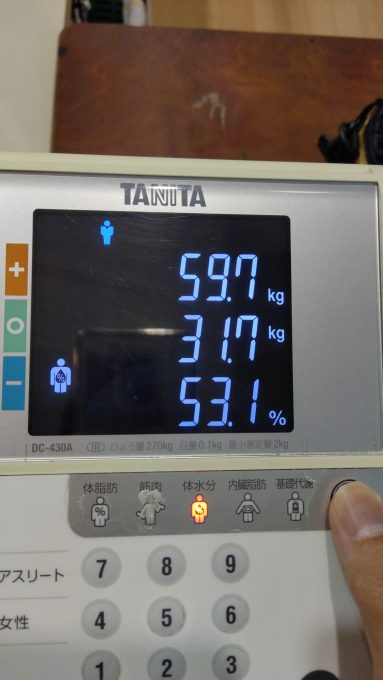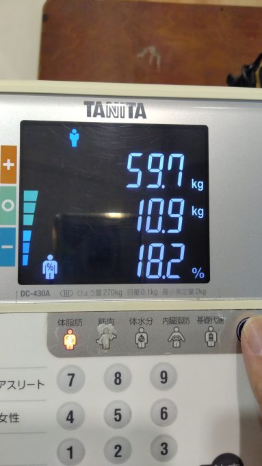 久々の60切り、そして体脂肪率減少&筋肉量アップ。着実に成果が出ているねえ。
