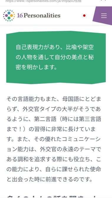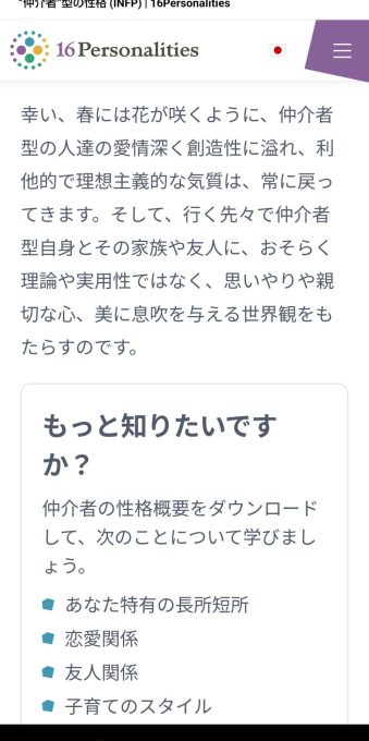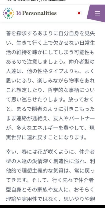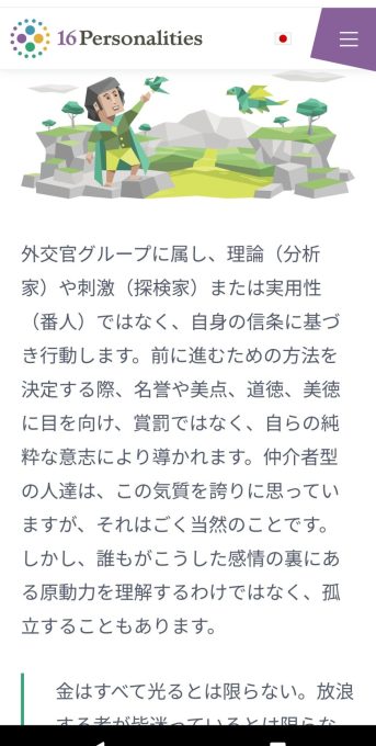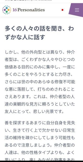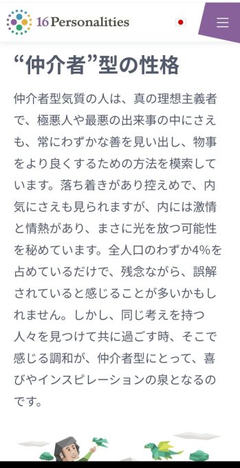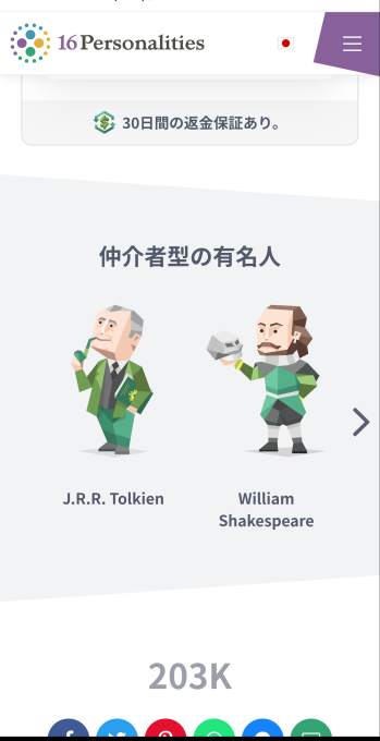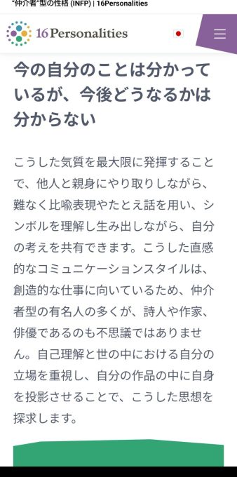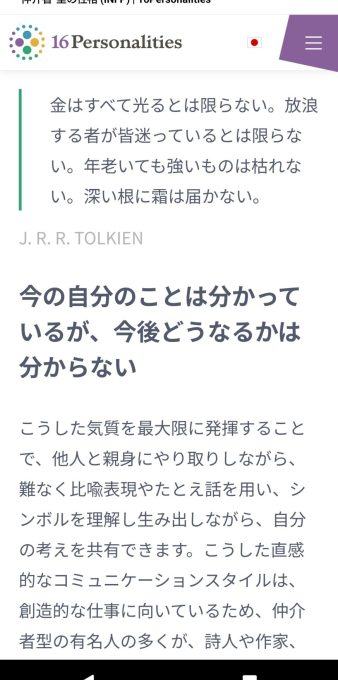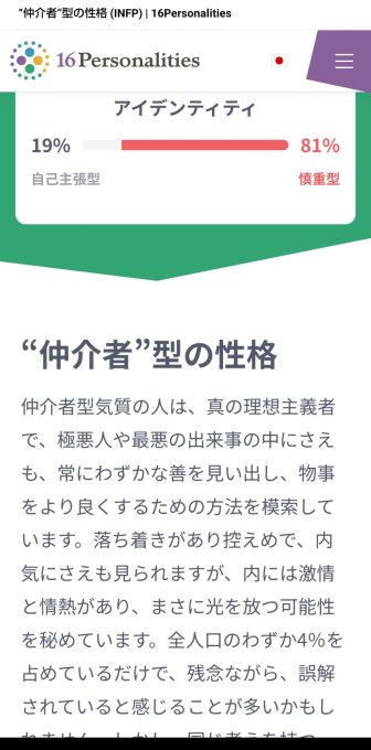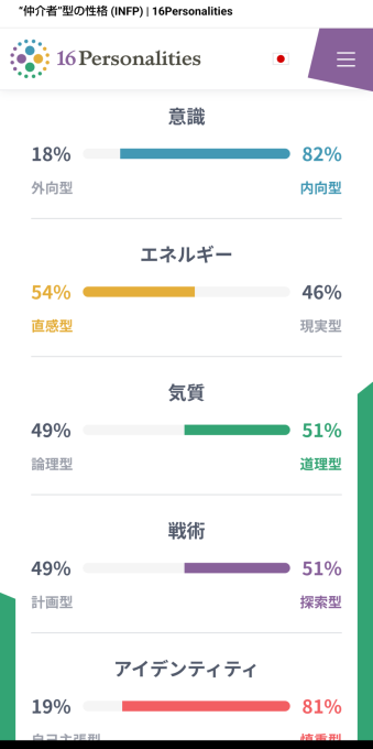 16Personalitiesブラック2023.07.24昼休みにピッグに誘われ、久々に性格診断テスト。Nob隊長に誘われてやった奴と同じ、前回とどう変わるかのう。前回の記事がコチラ性格診断はコチラ ではやってみるかのう。 ふむふむ…あともうちょい… さてさて、気になる結果は? ほう。 まあ、当たってる部分もあるかな?んで仲介型の有名人はトールキンやシェイクスピアみたい。ワシも小説書くかのう(笑)