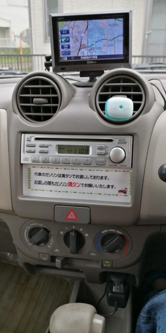 THE代車の軽自動車だけど、お店のご厚意かポータブルナビとETC装備。