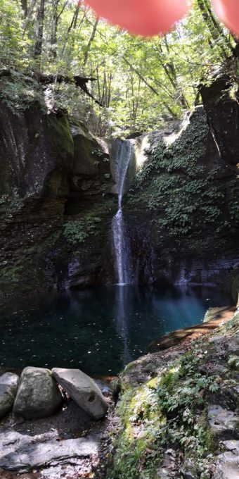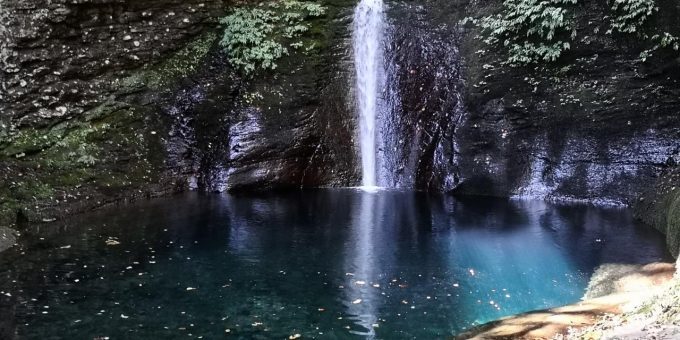 矢坂ハイキング(3)ブラック2019.10.02途中で滑ったりしながらも大体15分で目的地おしらじの滝に到着~雨上がりなんで流石にインスタとかに上げられた写真程透き通ってはいないが、見事なブルー!! そして滝が流れてる!! 実はこの滝は、滝が流れてるのは珍しい状態の様 雨上がりは比較的流れてるらしいです やっぱこういうのは自分の眼で見るとより感動するねえ