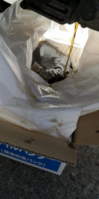 ワシのスカイウェイブは、オイル交換時は1900ML入れるので、2本買います。ではでは、Let’s オイル交換!!まずはエンジンを暖めた後、センタースタンドを立て、ドレンボルトの下に廃油処理箱を置きます。