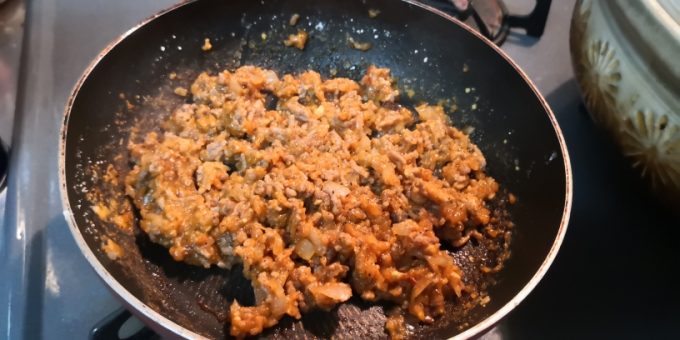 挽き肉とタマネギ炒めて、後は水にデミグラスソースにトマトサルサソースにコンソメにおろしニンニクに小麦粉にとフライパンにぶちこみ、適当に混ぜて煮詰めて完成~