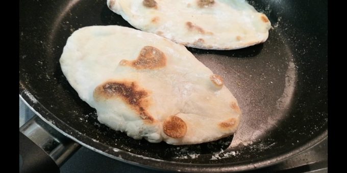 フライパンで蓋をして、弱火で良い感じになるまで焼けばナン完成~