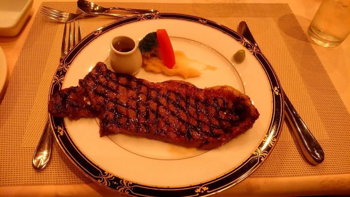 美味!いつも食べる食べ放題とは質が違うよね!中身はミディアムレアくらい。ナイフを入れるとスッと切れて脂身にさえ肉の味がする。肉の万世のステーキにコシがあるのとは対照的に、こちらのステーキは優しいテイスト。赤ワインじゃなくて白ワインが合うイメージかな。