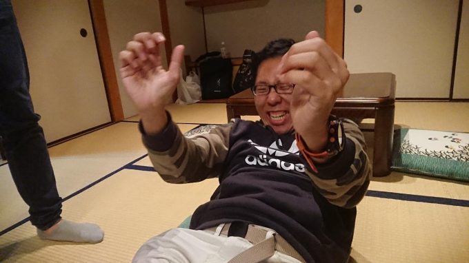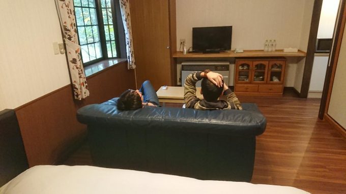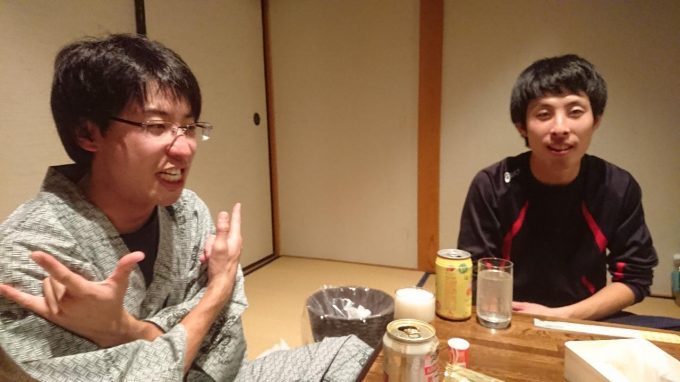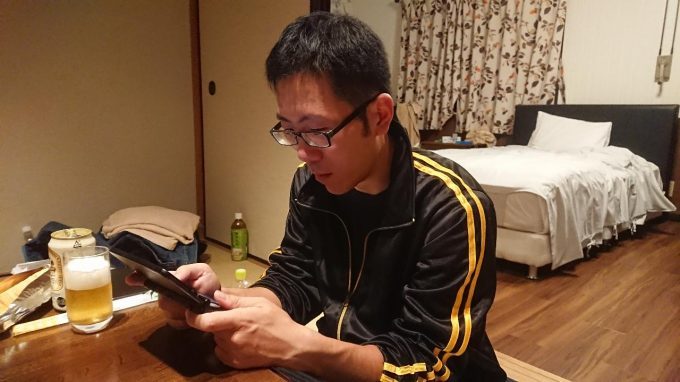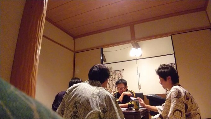 イメージ的にはホテルというよりも貸切別荘かな。4人だけど5人まで対応できる寝具数と余裕のある広さ、汎用性のある和室スペースなど久しぶりの晩酌を行うにはなかなか良い空間だと思う。さっそく寛ぐブラック君と鋼鉄豚君。キリタニ君は荷物の整理、私は動画用の撮影タイム。