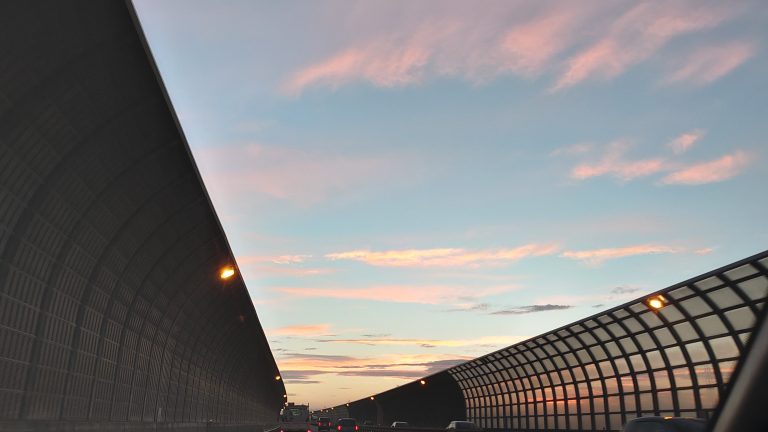 とある高速道路の風景。中華製ドラレコなので画質が悪いけど空の描写はなんとなく映っている。むしろ空が映って前方を走る車のナンバーが映らないのはさすが中華製!近いうちにちゃんとしたドラレコに買い換えるよ。