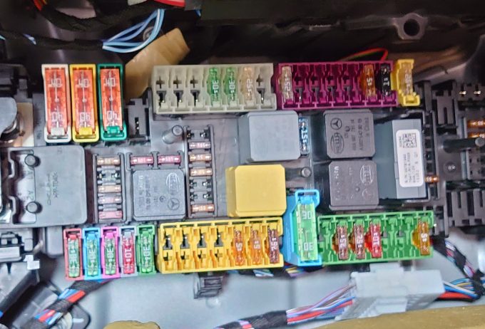 メルセデスのヒューズボックスは助手席シートの下にある。ここから電源を取り出せそうなヒューズを探す。各ヒューズの説明は説明書に書いてあるので、今回は無難にフロントシガーソケットから電源を取った。