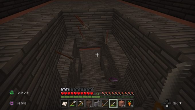 拡大を続けるネザー拠点。元々は左の通路上にポツンとあっただけの拠点が、右側に段々と延びていき…