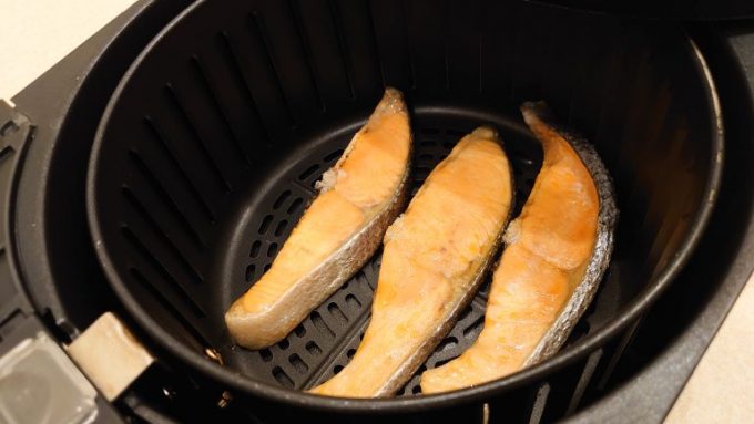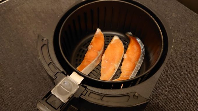 さっそく鮭をノンフライヤーで焼く!てか鮭の調理はノンフライヤーが超オススメ!だって魚の脂は逃さないし(魚の脂は牛や豚と異なり悪玉コレステロールにならない)こんがり焼けるし掃除も楽!