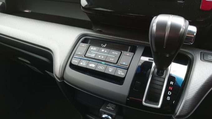 シフト周り。位置はホンダ車の特徴でもあるセンターシフト。ギアを見た感じDの下にSがあるのでおそらくCVT。