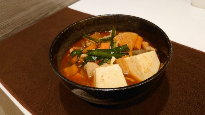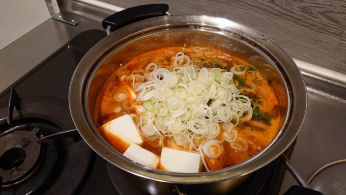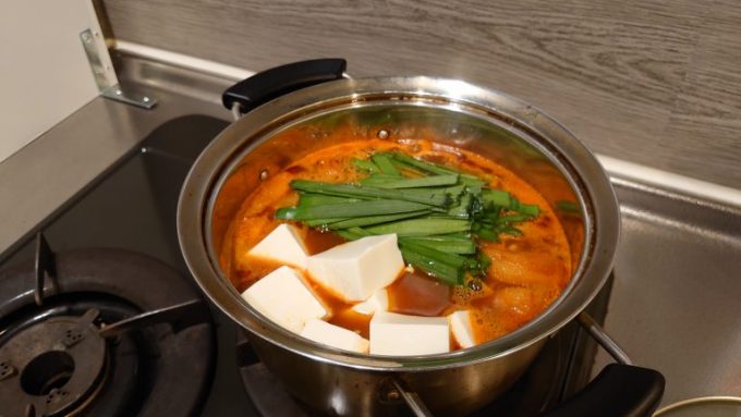 時間がなかったので鍋の素にモツ、豚汁の具、豆腐、ニラ、ネギを入れて煮込んだだけ。カップラーメンにお湯を入れて待つだけの感覚で、お湯が具材に変わっただけだからもはや料理とは言えないレベルの手抜き具合だよね。