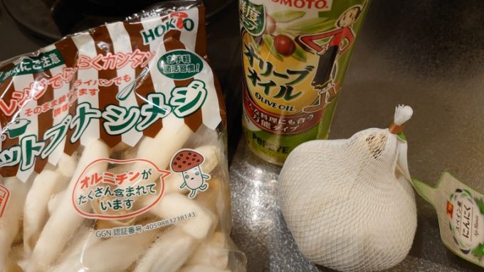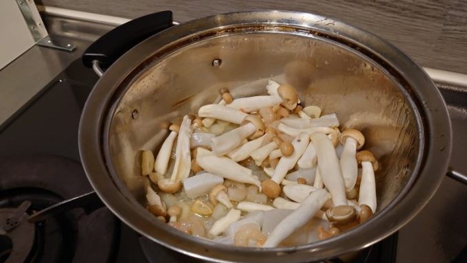 オリーブオイルを熱してからニンニク、唐辛子、しめじを投入!ニンニクは油で跳ねるから、あらかじめニンニクだけを蓋をして炒めたほうがいい。火を止めて油が跳ねなくなったら蓋を取り、しめじを入れれば台所も汚れない。