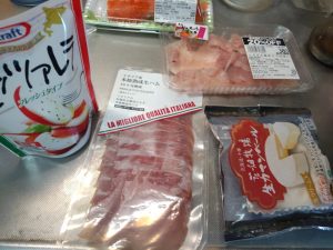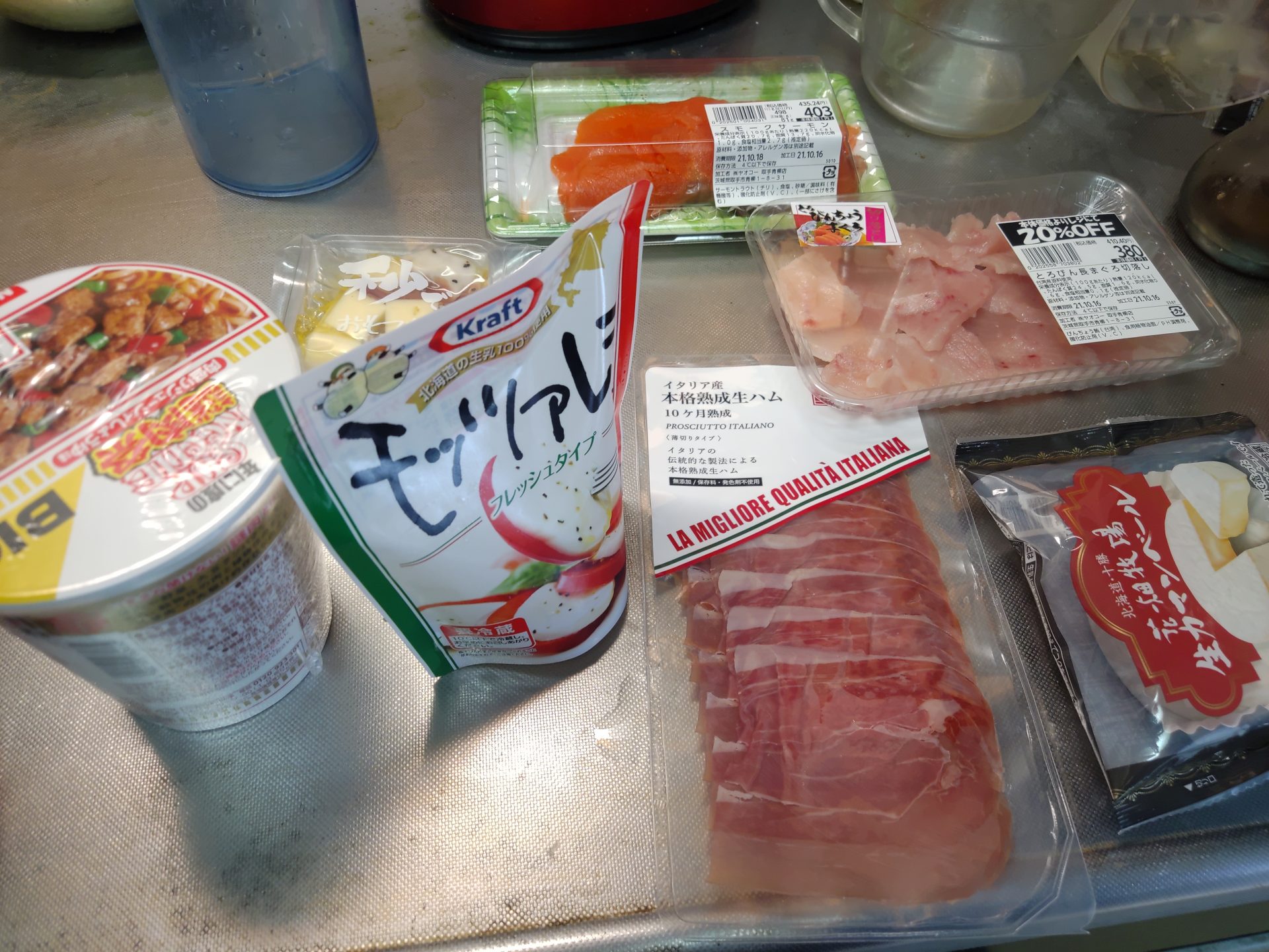ドレッシングと生ハムとチーズとマグロとサーモンとワインが2割引きの日だったので、早速お買い物。